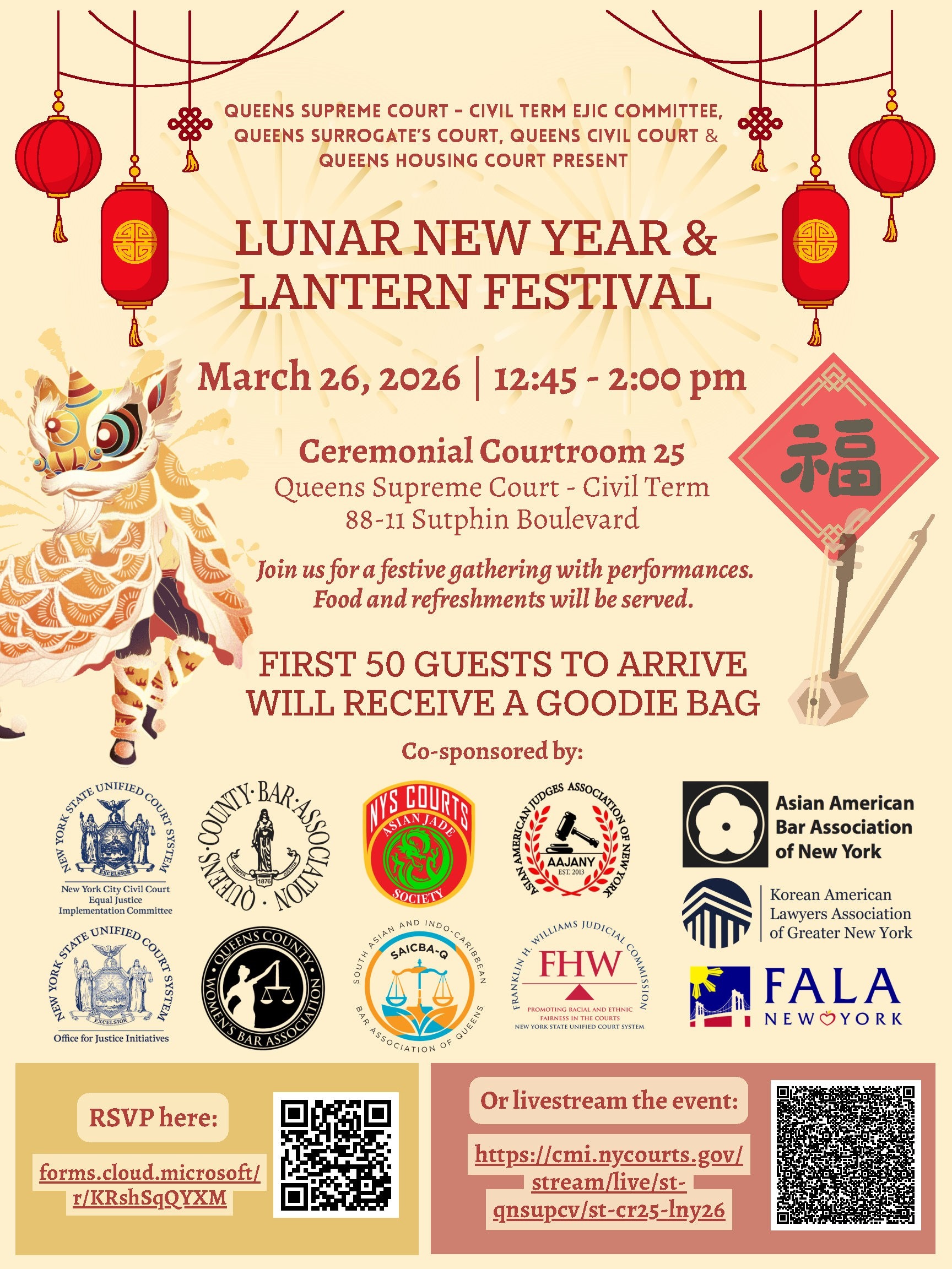 Please join us for the inaugural Lunar New Year and Lantern Festival Celebration on March 26, 2026, from 12:45 pm to 2:00 pm at Queens Supreme Court – Civil Term’s Ceremonial Courtroom 25. Food and refreshments will be served. First 50 people to arrive will receive a goodie bag.