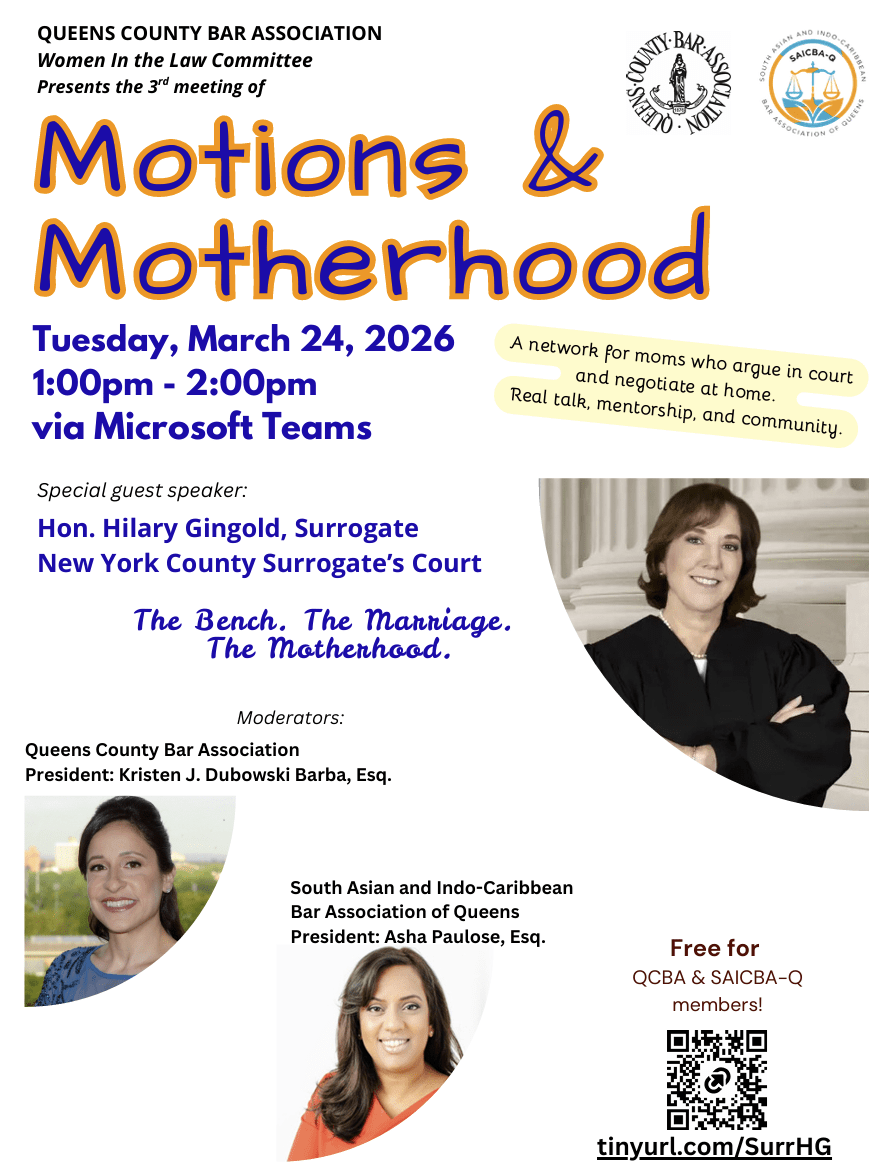 Join us on Tuesday, March 24, 2026 at 1:00pm – 2:00pm for our third monthly meeting of “Motions and Motherhood” featuring special guest speaker Hon. Hilary Gingold (Surrogate, New York County Surrogate’s Court) and moderated by QCBA President Kristen J. Dubowski Barba, Esq. and SAICBA-Q President Asha Paulose, Esq.